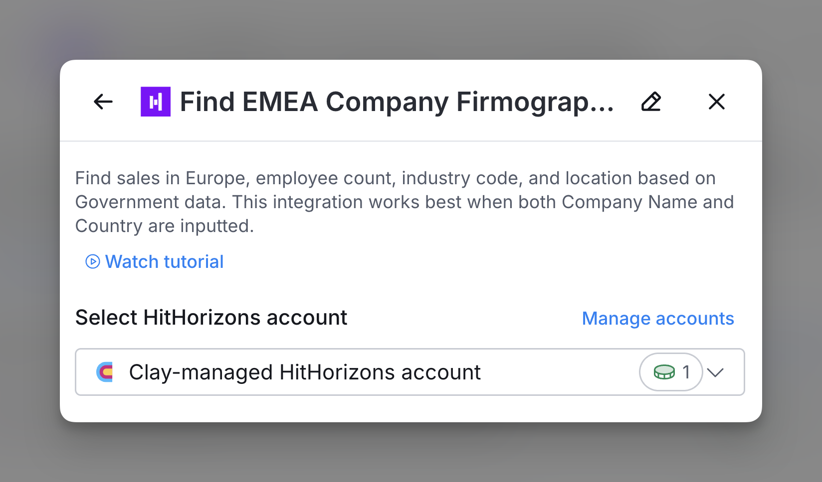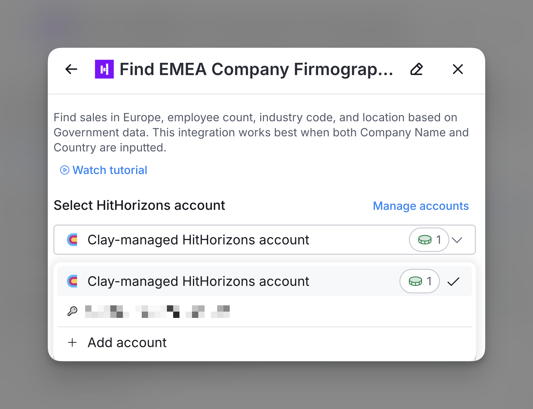 By default, HitHorizons enrichments in Clay use the Clay-managed HitHorizons account, which charges one credit for each enrichment.